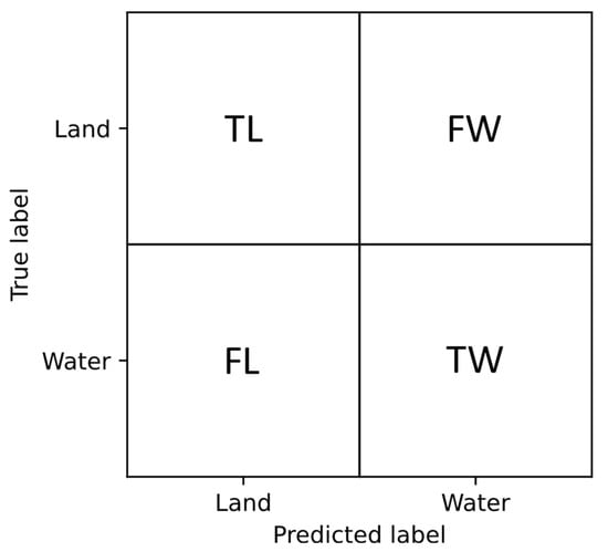 The first set of metrics is derived from the confusion matrix, which compares the predicted classes with the true classes for each pixel. For clarity, the structure of the confusion matrix is shown in Figure 8. The diagonal elements of the matrix represent correctly classified pixels—true land (TL) and true water (TW). In contrast, the off-diagonal elements represent misclassified pixels: false water (FW) and false land (FL).