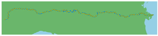 A set of 100 virtual gauge stations, corresponding to an equal number of Sentinel-2 sub-tiles, is implemented to achieve a comprehensive monitoring of the entire Po River. As shown in Figure 9, these stations are positioned randomly within the EU-Hydro polygon of the river using QGIS 3.28 software, with a minimum separation of 0.04 degrees between each pair of points.