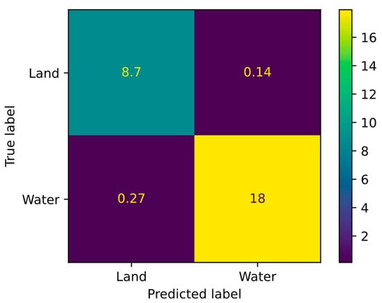 The performance of the DNN has been evaluated as described in Section 2.4 by calculating the confusion matrix across the 433 images selected as validation set from the SNOWED dataset (Figure 10), with the corresponding metrics presented in Table 2. The results show that all metrics are close to their maximum values. Additionally, the metrics for the water class, which is the class of primary interest, are higher than those for the land class with the DNN achieving a mean IoU of 96.7%, indicating a high degree of overlap between the predicted and true masks.