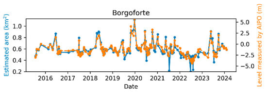 The river monitoring has been performed by downloading the Sentinel-2 images specified in Section 2.1.3, and then extracting 256 × 256 sub-tiles centered on the virtual gauge stations. Then, the surface water area has been measured for all the sub-tiles, using the sensing algorithm described in Section 2.3.