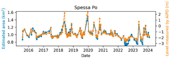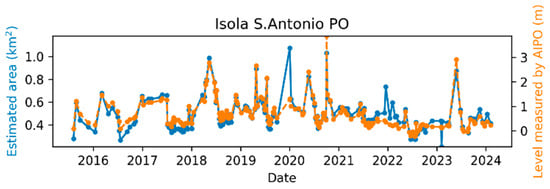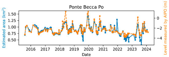 Publicly available Sentinel-2 data products used in this study can be found at: https://dataspace.copernicus.eu/ (accessed on 5 June 2024). Publicly available Po River water level measurements used in this study can be found at: https://www.agenziapo.it/content/monitoraggio-idrografico-0 (accessed on 26 January 2024).