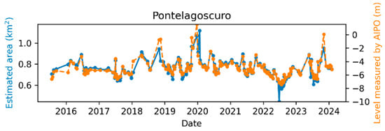 In addition, to evaluate the DNN water/land segmentation performance as described in Section 2.4, the complete sensing algorithm presented in Section 2.3 is validated using data from the Po River. This validation involves comparing water area measurements from the SNOWED-based system with depth variations provided by AIPo []. Specifically, depth variations recorded by AIPo at locations shown in Figure 3 are compared with water area changes measured by the SNOWED-based system at the same locations. Although water area and water depth are distinct quantities, both are hydraulic variables that determine and are influenced by local water volume. As a matter of fact, both water surface [,] and water depth [] have been used to monitor spatiotemporal variations in river volumes and flows. This comparison thus offers a challenging and reliable method to assess the effectiveness of the remote sensing approach for meaningful and accurate river monitoring.