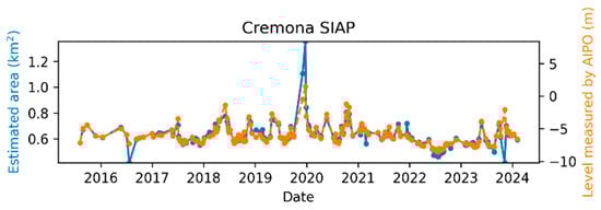 The comparison between the AIPo river depth measurements and those from the remote sensing algorithm is illustrated in Figure 11, Figure 12, Figure 13, Figure 14, Figure 15 and Figure 16, which depict the results obtained at six different AIPo gauge stations, namely, Borgoforte, Spessa Po, Isola Sant’Antonio PO, Ponte Becca PO, Pontelagoscuro, and Cremona SIAP demonstrating a highly consistent correspondence between remote and local monitoring, with occasional outliers that are easily identifiable in Figure 11, Figure 12, Figure 13, Figure 14, Figure 15 and Figure 16.