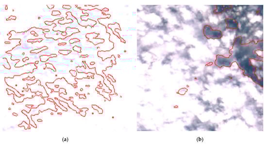 By reviewing the satellite images on the dates and positions of the outliers, it is evident that these anomalies are due to adverse weather conditions such as clouds, snow, or fog. Despite discarding sub-tiles with excessive cloud cover, as outlined in Section 2.1.3, the Sentinel-2A scene classification algorithm occasionally fails to identify defective sub-tiles. Consequently, sometimes it is impossible for the DNN (or any algorithm having access only to Sentinel-2 imagery) to identify water areas. Figure 17 shows the TCI satellite images for two of such cases. In a more advanced implementation of the method, cloud detection can be easily enhanced using deep learning techniques, which are already well-established in the literature [,], to identify and discard all sub-tiles containing clouds.
