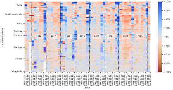 The outcomes of the Po River monitoring by the 100 virtual stations described in Section 2.6, spanning the 9-year period from 2015 to 2024, are shown in the heatmap in Figure 18.