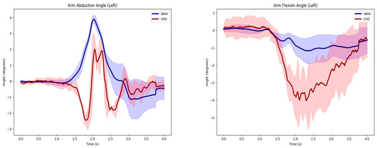 Left and right shoulder joint abduction and flexion angles are represented by the average curves between Vicon motion capture (V3D) shown in red, and the Valor inertial measurement unit (Valor), shown in blue. Data from a representative subject performing the vertical jump task.