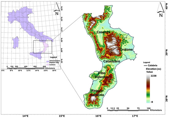 Location of the AOI: The Italian peninsula with regional boundaries on the left, and a detailed, zoomed—in view of Calabria on the right, reporting its provinces and Digital Elevation Model (DEM).
