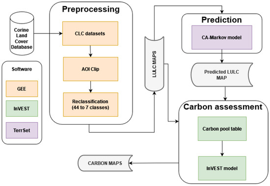 It is worth noting that, until a few decades ago, forest monitoring primarily depended on on-site surveys, which were not only costly but also time- and energy-consuming, even when high accuracy was not a significant concern [19]. Past field surveys were confined to assessing tree heights, tree counts, and canopy coverage percentages using fixed plots [20,21]. A significant advancement in forest monitoring was the introduction of aerial photography [22]. However, the poor accuracy of optical sensors used in the past hindered substantial progress. Nowadays, advancements in Remote Sensing (RS) technology, particularly through high-resolution satellite imagery, enable the tracking of gradual or sudden alterations in forest cover [23]. The availability of such images in convenient time-series formats has elevated RS to the foremost method for efficient forest monitoring and change detection [24,25]. To estimate forest carbon, various satellite missions provide essential optical imagery. Multispectral imagery from Landsat missions, high-spectral-resolution hyperspectral imagery such as EO-1 Hyperion, high-resolution imagery such as WorldView-3, and 3D structural data with optical imagery such as LiDAR-integrated imagery from Sentinel-2 could enhance biomass and carbon stock estimates by allowing the precise identification and detailed mapping of tree species, as well as disturbance detection. Nevertheless, for RS-based research to have global applicability, satellite images from diverse sensors must be readily accessible, free of charge, and easily obtainable for each region at acceptable spatial and temporal resolutions. This poses a challenging and costly task that requires massive computational and storage capacity. In response to this need, various cloud-based platforms equipped with high-performance computing capabilities to facilitate online RS dataset processing were developed over time and include Amazon Web Services, which contains a comprehensive suite of tools for processing large satellite datasets with scalable options and direct satellite data access; Google Earth Engine (GEE), which simplifies geospatial analysis with its vast data catalog and cloud-based processing and is ideal for rapid assessments; Sentinel Hub, which specializes in the efficient access and processing of Sentinel data and is perfect for high-resolution monitoring; Microsoft Azure’s Planetary Computer, which integrates AI with geospatial data for large-scale environmental research; IBM Cloud with Watson, which provides advanced AI tools for geospatial analysis; and DeepESDL, which focuses on multi-dimensional data and deep learning for integrated environmental research. The choice depends on the data needs, the scale of the analysis, and computational requirements. This study utilizes GEE for its vast data catalog and cloud-based processing, launched on 2 December 2010 [26]. The GEE platform allows users to perform geospatial analysis on Google’s infrastructure through various methods, including the Code Editor, a web-based integrated development environment for scripting, and the Explorer, a lightweight web app for data exploration and simple analyses. Additionally, GEE offers client libraries with JavaScript and Python wrappers around the Earth Engine application programming interface, enabling the creation of custom applications and the local development of Earth Engine code, with numerous demos available in the GitHub repository. To address the challenges of monitoring and mitigating climate change, it is crucial to understand the carbon dynamics within our planet’s ecosystems. While the terrestrial biosphere, ocean, and atmosphere serve as carbon reservoirs, with Carbon dioxide (CO2) naturally cycling through these systems, they are currently unable to absorb all anthropogenic CO2 emissions. According to Prentice et al. [27], after the industrial era, atmospheric concentrations of CO2 have risen continuously primarily due to anthropogenic emissions from fossil fuel burning, which accounted for about three-quarters of the emissions. This escalating atmospheric CO2 concentration causes global warming and degrades ESs and biodiversity, thereby impacting both human life and ecological health [28]. To mitigate this accumulation, it is essential to enhance natural carbon pools and create new carbon sinks through terrestrial CS, which involves transferring atmospheric CO2 into biotic and pedologic carbon pools; this process occurs when the natural uptake of carbon by plants and soils surpasses the losses from plant and soil respiration and biomass removal, consequently storing CO2 in vegetation and soils, both above- and below-ground, known as phyto-sequestration and soil CS, respectively [29]. Various international scientific groups have recommended the Integrated Valuation of Ecosystem Services and Tradeoffs (InVEST) model as an advanced tool for assessing ES and quantified and mapped carbon storage and sequestration [30,31,32]. Studies have shown that as an important component of global carbon storage and emissions, terrestrial ecosystems play an important role in mitigating climate change [33,34]. The CS capacity of different LULC types exhibits significant differences. For instance, Zhang et al. [35] showed that the change in LULC caused a loss of 279 Teragram (Tg) of carbon storage in China’s terrestrial ecosystems from 1980 to 2010. Therefore, it is efficient to understand the characteristics of regional carbon storage and carbon balance changes from the perspective of LULC types, including the changes in carbon balance caused by LULC structural changes. Additionally, it is important to consider carbon storage potential under various future scenarios and the impact of land resource management on carbon balance. Furthermore, in most LULC studies, the accuracy assessment and validation of LULC classifications and predictive models are performed using kappa parameters, which serve as a measure of ag