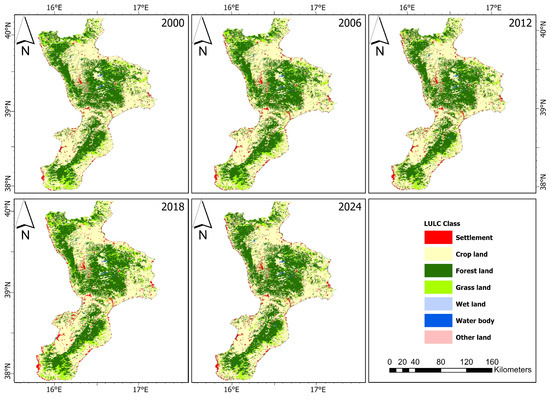 In the second step, a systematic methodology was employed as described by IPCC 2006 [44,45] to perform LULC calculations for the years 2000, 2006, 2012, and 2018 [46]. The primary objective of the LULC mapping process was to provide comprehensive information regarding the spatial distribution of distinct land use categories. Furthermore, the methodology aimed to identify and quantify LULC changes over 6-year intervals, specifically focusing on the temporal evolution from 2000 to 2018. The simulation and projection of the changes in LULC in Calabria between 2000 and 2018 served as the foundation for predicting the future landscape in 2024.
