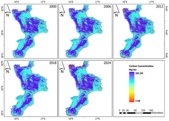 The same CA–Markov model was employed in this study to predict the LULC of Calabria for 2024. The predictive model relied on a transition probability matrix that encapsulated the probability that each LULC class would transition to another class. Firstly, three transition probability matrices were calculated by the cross-tabulation of LULC maps for the periods 2000–2006, 2006–2012, and 2012–2018. An average probability matrix was then derived by averaging these three matrices. By considering three transition periods and calculating an average transition probability matrix, the model gains increased in robustness and accuracy in predicting future LULC changes. This approach captures a broader range of land use dynamics over multiple time intervals, reducing the influence of anomalies or short-term fluctuations specific to any single period. As a result, the model provides a more reliable and representative projection of future land use changes, leading to better-informed decisions and more accurate assessments of carbon storage potential and other landscape dynamics. This average transition probability matrix, along with the 2018 LULC map, served as input data to the CA–Markov model, which subsequently predicted the LULC for 2024. The CA–Markov model used a conventional 5 × 5 contiguity filter and considered six iterations of CA, one iteration for each future year.