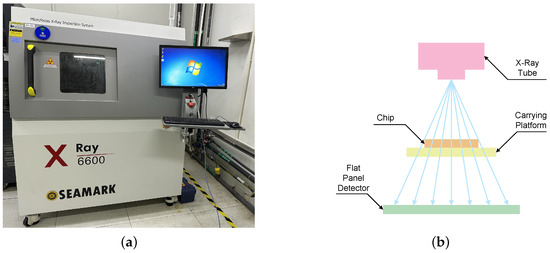 The X-ray images of the chips used in this study were obtained using an X-ray inspection machine, as shown in Figure 1a. The machine, an X6600 model manufactured by Seamark ZM, shenzhen, China, consists mainly of five parts: X-ray tube, support system, flat panel detector (FPD), imaging system, and computer control system. The machine supports CNC inspection mode and fast automatic detection over multiple arrays. Figure 1b illustrates the principle of chip X-ray imaging. During image acquisition, an X-ray tube generates a beam of high-energy X-rays. As X-rays pass through the chip, different materials absorb them to varying degrees. Denser materials or those with a higher atomic number (such as metals) absorb more X-rays, while less dense materials (such as ceramics) absorb fewer. Consequently, the intensity of the X-rays changes as they pass through the chip. The FPD receives X-rays from the X-ray tube and converts the X-ray intensity signal into a digital image.
