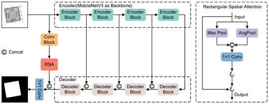 U-Net, a fully convolutional neural network architecture originally proposed by Ronneberger et al. [19] for biomedical image segmentation, features a symmetric encoder–decoder structure with skip connections that effectively captures image features across scales, making it highly suitable for various segmentation tasks. Because of its effectiveness, we use the U-Net architecture as the basis for our segmentation tasks. However, the high computational demand of U-Net when processing high-resolution images is a significant limitation in industrial applications where real-time processing is essential. To address this, we propose a more efficient model, RSALite-UNet, which aims to improve both the speed and accuracy of chip cover segmentation, as shown in Figure 3. This model uses the lightweight MobileNetV3 [27] for feature extraction, significantly reducing the number of parameters and the computational load while preserving essential feature information. The decoder in RSALite-UNet consists of convolutional blocks and bilinear interpolation for upsampling, where each convolutional block contains two convolutional layers, followed by batch normalization (BN) and ReLU activation. To further improve segmentation accuracy, we introduce a rectangular spatial attention module within the skip connections between the encoder and decoder, which allows the decoding network to capture both detailed and global information more effectively.