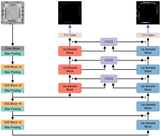 We propose a Dual Decoder Mamba U-Net (DM-UNet) for chip void defect segmentation, the architecture of which is shown in Figure 4. This architecture consists of three key components: a Mamba-based encoder, a feature correlation cross gate module, and a dual-stream decoder. The following sections provide a detailed description of these three key components.