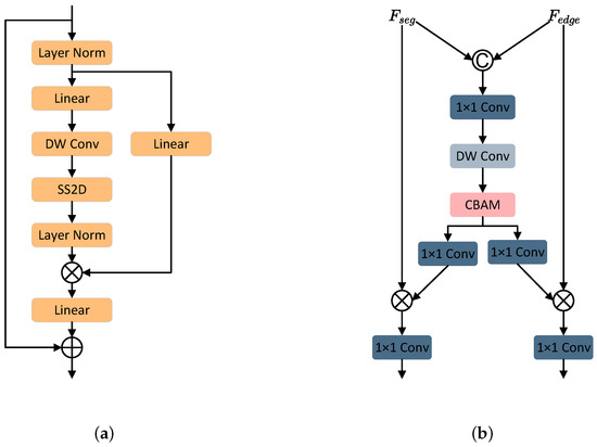 CNNs face challenges in capturing long-range dependencies due to their limited receptive fields, which can lead to inadequate feature extraction and poor segmentation results. On the other hand, transformer-based models are highly effective for global modeling, but their self-attention mechanisms involve quadratic computational complexity, leading to a significant computational burden [30]. In contrast, Vision Mamba [31] maintains linear complexity while effectively modeling long-range dependencies, demonstrating superior accuracy with lower computational and memory overheads in visual tasks. Consequently, we adopt Vision State Space (VSS) blocks as the core units of the encoder. The Vision State Space (VSS) block contains a two-dimensional selective scanning (SS2D) module. SS2D bridges the gap between the ordered nature of one-dimensional selective scanning and the non-sequential structure of two-dimensional visual data by traversing four scan paths. This approach gathers global contextual information from multiple sources and angles, addressing the size variation of chip defects. The SS2D module comprises three key components: the scan expansion operation, the S6 block, and the scan merging operation. For a more comprehensive explanation of SS2D, please refer to [31]. The overall architecture of the VSS block is depicted in Figure 5a. The encoder is organized into five stages. The first stage consists of two successive convolution blocks. Each subsequent stage contains VSS blocks for high-level feature extraction and max pooling operations for downsampling. The number of VSS blocks in the second to fifth stages is . The feature dimensions after each stage are . Using the feature extraction capabilities of VSS blocks allows the use of fewer feature dimensions, significantly improving computational efficiency.