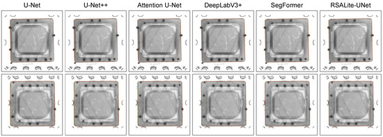Table 3 presents a quantitative comparison of the segmentation performance of the aforementioned methods, with the most favorable results highlighted in bold. As demonstrated in Table 3, RSALite-UNet attained the highest mean IoU and boundary IoU, reaching 99.52% and 81.27%, respectively. Furthermore, in comparison to other models, RSALite-UNet markedly reduced the model size and computational overhead, necessitating only 4.10 GFLOPs and 3.77 million parameters, whereas the second-ranked U-Net++ required 200.79 GFLOPs and 11.81 million parameters. These findings suggest that RSALite-UNet is capable of achieving high levels of segmentation accuracy while simultaneously reducing the complexity of the underlying network architecture, making it a highly suitable choice for deployment in real-world industrial settings.