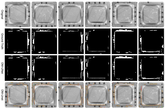Figure 7 shows the segmentation results of DM-UNet on the custom-built CIDX-Ray1950 dataset. The first row displays the original images of the chip cover, the second row shows the annotated chip defect results, the third row presents the binary images from the BGM-UNet network test results, and the fourth row shows the boundary images from the BGM-UNet network test results overlaid with the annotated defects. Green represents the true defect boundaries while red represents the predicted defect boundaries. As shown in Figure 7, the segmentation results of the proposed model more accurately detail defect edges and can identify smaller, harder-to-distinguish defects.