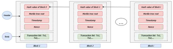 The data, stored as transactions, are part of the block’s body. These data are essentially the leaf nodes in the aforementioned reverse hashing process in the Merkle tree. Figure 1 illustrates a typical blockchain structure.