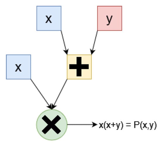 This circuit takes as input x, y and computes the result of using the addition and multiplication gates.