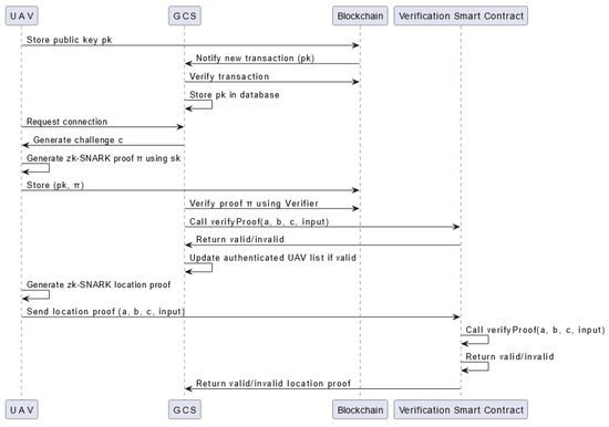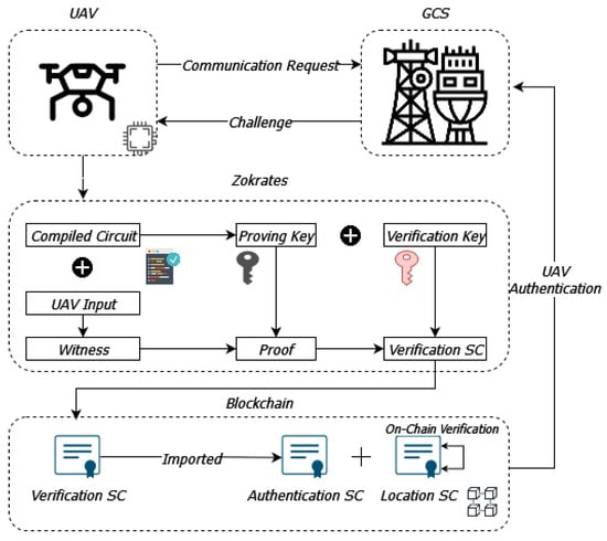 Firstly, there are four main participants in such a system: the UAV, the ground control station (GCS), the user who interacts with the UAV through the GCS, and the smart contract (SC) that automates the verification process on-chain (blockchain). The trusted GCS develops and deploys the SC on the Ethereum blockchain. The SC is designed to include the verification process code for the authentication and proof of location of the UAV, as it is produced by the Zokrates tool. A high-level overview of the proposed architecture is illustrated in Figure 3.