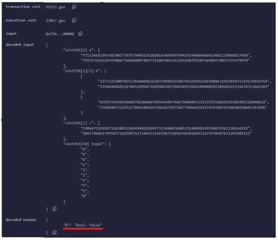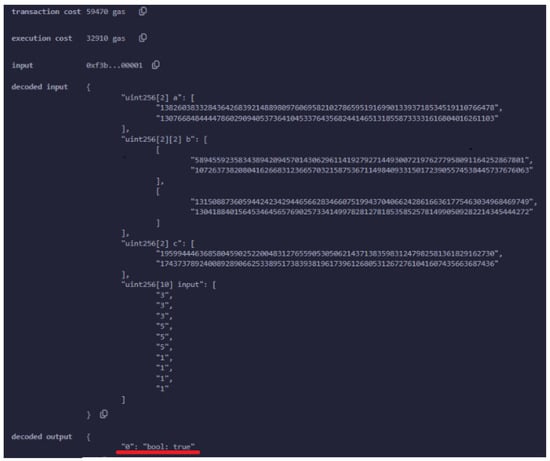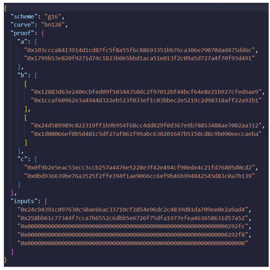 Here, a, b, and c are the proof elements used in the construction of zk-SNARK for Groth16 [50]; this is the key part of the proof so that both its integrity and zero-knowledge property can hold. More precisely, commitment element a is a combination of the secret parameter , the value of polynomial in secret point s and a randomization factor, while b is built similarly using a different secret parameter and another randomization factor element. Finally, c is a more complex element since it is calculated from a combination of mid-polynomial evaluations of these polynomials to ensure the entire proof’s consistency. A pairing equation that utilizes these elements is used by the verifier to confirm the proof’s validity without revealing any information about the underlying witness.