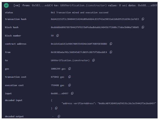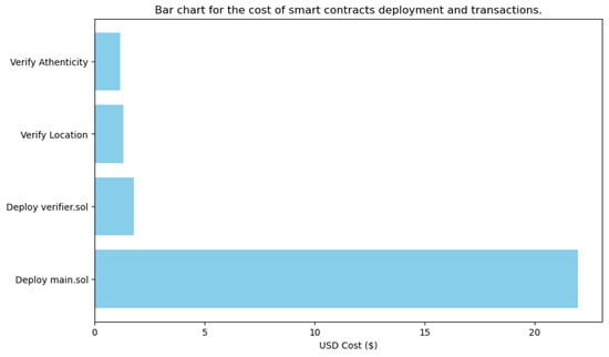 The financial cost associated with conducting a transaction to verify whether the UAV is within the specified area or not is approximately 59,470 gas units. This amount of gas translates to roughly ETH 0.00036841665, which is approximately USD 1.3. These costs are significant, particularly in scenarios involving multiple UAVs or frequent verification requests, as they can add up quickly and impact the overall budget for UAV operations. The bar graph presented in Figure 12 provides a visual summary of the costs in USD associated with deploying and interacting with the smart contracts that were presented before. This graph is crucial for understanding the financial implications of utilizing blockchain technology in zk-SNARK-based UAV operations, as it breaks down the various costs associated with different stages of smart contract deployment and interaction. The costs illustrated in this graph are vital for strategic planning and decision-making within organizations, considering the implementation of blockchain-based solutions for UAV authentication and area verification.