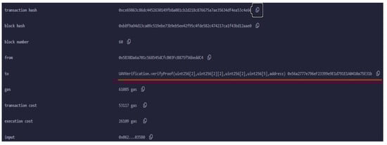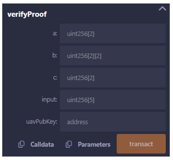 Once the proof is generated, it is sent to the verification smart contract (SC) on the blockchain. The smart contract, which has been pre-deployed by the GCS, includes the necessary logic to verify the proof. This involves using the verification key to check the validity of the proof provided by the UAV. If the proof is valid, the smart contract confirms the UAV’s authentication and location, ensuring that only legitimate UAVs can interact with the GCS and transmit data.