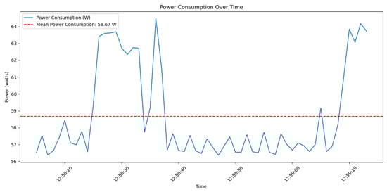 Despite the promising potential of using blockchain technology and zk-SNARKs to enhance the security and privacy of UAV systems, several limitations need to be addressed. One major limitation is the computational overhead associated with generating and verifying zk-SNARK proofs. These cryptographic operations are computationally intensive, which can be a significant constraint for UAVs with limited processing capabilities and energy resources. As illustrated in Figure 13, the mean value for the power consumption is approximately 58.7 W for a period of 60 s. This could be acceptable regarding the UAV mission. For instance, in a small quad-rotor drone, which usually has a 30 Wh battery, if we assume that each rotor demands approximately 30 W, the sensors and communication systems require 15 W, and the navigation systems require 5 W, then the total power consumption is approximately 198.6 W (including the zk-SNARK operations). Therefore, the total flight time is approximately 30 Wh/198.6 W ≈ 0.151 h ≈ 9.1 min. A flight time of 9.1 min is impractical for most applications.
