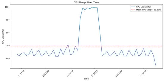 Additionally, the graph in Figure 14 demonstrates the CPU utilization over time while performing the same elliptic curve operations, which are integral to zk-SNARK proof generation. The fluctuations in CPU usage highlight the varying computational demands during different stages of the zk-SNARK operations.