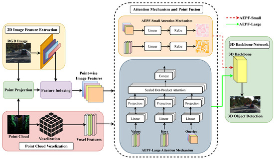Architecture for AEPF: Attention-Enabled Point Fusion for 3D object detection. Blocks illustrate processes from Section 3.1, Section 3.2, Section 3.3 and Section 3.4. Attention mechanisms for AEPF-Small and AEPF-Large are also shown.