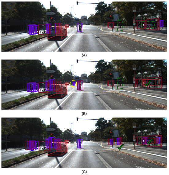 Visualization of detection results for (A) MVXNet (obtained from [53]), (B) AEPF-S, and (C) AEPF-L. Dotted green lines indicate false negatives, while dotted yellow lines indicate false positives. AEPF-L effectively resolves false negatives identified by MVXNet and AEPF-S. Purple bounding boxes indicate pedestrians and red bounding boxes indicate cars.