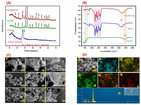 The crystallinity and structure of the synthesized products were analyzed by XRD patterns. Figure 1A explains the XRD patterns of Cu2Y2O5, g-C3N4 and g-C3N4/Cu2Y2O5. The XRD pattern of Cu2Y2O5 indicates the crystalline nature with super-accurate distinct peak intensity; likewise, there were no extra diffraction peaks noted. It was matched with a JCPDS card number 00-33-0511. The XRD pattern of g-C3N4 displays two unique diffraction peaks, at 13.18° and 26.68°. These peaks are related to the crystal lattices (100) and (002); these are linked with the interplanar aromatic stacking (100) planes (JCPDS card number 01-087-1526) [28,29]. In contrast to the bulk g-C3N4, the power of the (002) peak in g-C3N4 nanosheets dropped significantly. They show the successful exfoliation of bulk g-C3N4, as illustrated in Figure 1A. Further, the XRD nature of the g-C3N4/Cu2Y2O5 composite is displayed in Figure 1A. The noticeable peaks of Cu2Y2O5 were formed by the crystalline plane. The sharp peak of g-C3N4 was caused by the (002) plane. The crystalline plane overlapped to produce a more dramatic peak than pure g-C3N4 [28]. However, each single distinct plane was seen in the Cu2Y2O5/g-C3N4 composite; this demonstrated the successful production of the Cu2Y2O5/g-C3N4 composite.
