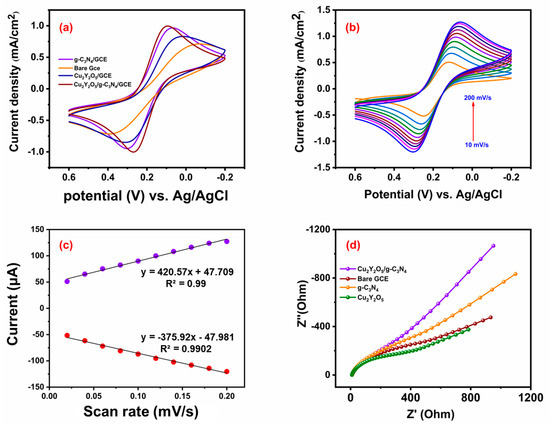 (a) CV for bare GCE, GCE/Cu2Y2O5, GCE/g-C3N4, GCE/Cu2Y2O5/g-C3N4 in 0.1 M KCl contain 5 mM [Fe(CN)6]3−/4− and (b) CV studies of Cu2Y2O5/g-C3N4 at various scan rates (different color indicate for different scan rate). (c) calibration plot for potential vs. peak current. (d) EIS spectra of bare GCE, Cu2Y2O5/GCE, g-C3N4/GCE, Cu2Y2O5/g-C3N4/GCE.