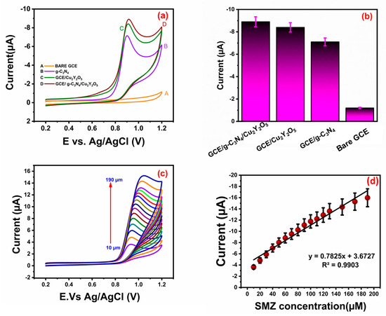 (a) Cyclic voltammogram of bare GCE, GCE/g-C3N4, GCE/Cu2Y2O5, and GCE/g-C3N4/Cu2Y2O5 in 0.05 M phosphate-buffered solution (pH 7) with 50 μM of SMZ. (b) Bar diagram of different electrode responses. (c) CV curves of GCE/g-C3N4/Cu2Y2O5 electrode at different concentrations of SMZ (10–200 μM) (different color indicate for different concentration). (d) Correspondence to the calibration plot vs. SMZ concentrations.
