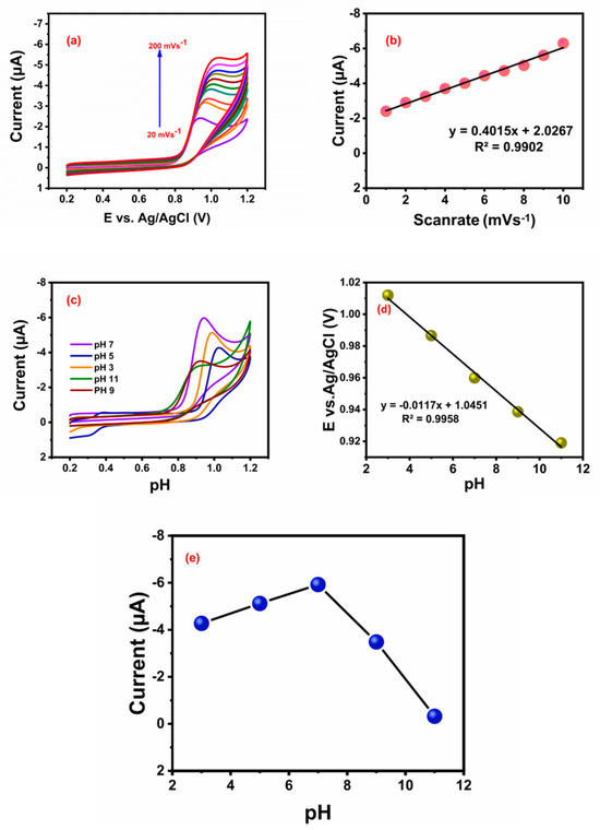 Here “m” denotes the number of protons, “n” the number of electrons engaged in the electro-chemical process, “a” and “b” the oxidant and reductant coefficients, and so on [40]. The oxidation peak potential (Epa) vs. pH is represented in the calibration plots shown in Figure 4c,d.