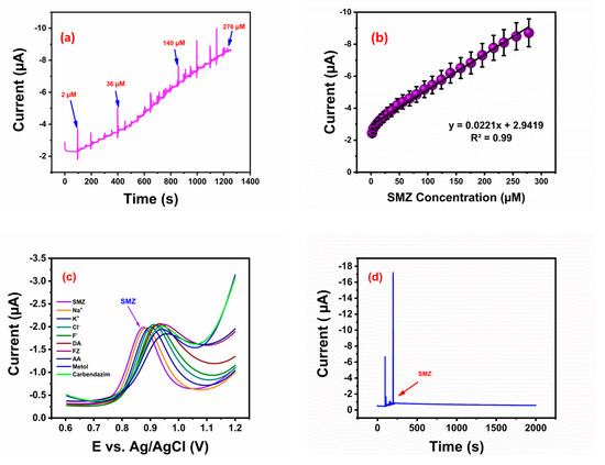 The selective oxidation towards SMZ might be quickened by a favorable π-π stacking contact that occurs among the SMZ molecule and the Cu2Y2O5/g-C3N4 composite. Furthermore, the hindering molecules’ oxidation potential was in contrast to the range of oxidation of the SMZ. Therefore, it does not interrupt the SMZ oxidation current density [35]. Additionally, the sensor’s stability, repeatability, and reproducibility were examined for SMZ oxidation and are displayed in Figure 6a–d. This is why the GCE/g-C3N4/Cu2Y2O5 electrodes were prepared five times independently to be able to assess the reliability of the sensors. The experiment of testing 50 μM SMZ at the GCE/g-C3N4/Cu2Y2O5 electrode multiple times was employed to examine the sensor’s repeatability and stability. Long-term stability was assessed after storing it for approximately 1, 7, 14, 21, and 30 days. The sensors kept 93.8% of the responses. The sensors showed excellent reproducibility in the same procedure. Additionally, Figure 6e shows the long-usage stability of the GCE/g-C3N4/Cu2Y2O5 electrode utilizing continuous CV monitoring for 100 segments in 0.1 M phosphate-buffered solution. During this period, the electrode current responsiveness only dropped by about 12%. The outcomes verified that, following analyses and extended periods of storage, the GCE/g-C3N4/Cu2Y2O5 had demonstrated outstanding stability. Additionally, 50 s intervals were used to spike 10 μM and 20 μM of SMZ in the amperometry stability investigation, determined up to 2000 s. After stability testing, the prepared sensor maintained 98.79% of its initial efficiency.