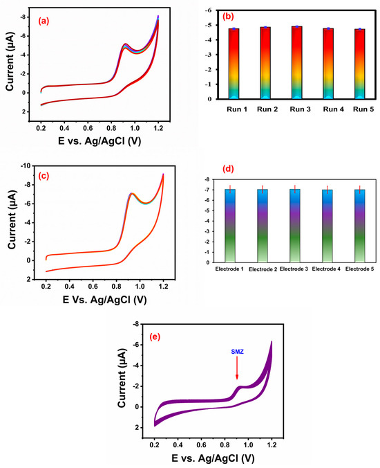 (a) Repeatability test of electrode GCE/g-C3N4/Cu2Y2O5 in the presence of SMZ and (b) Bar diagram of GCE/g-C3N4/Cu2Y2O5 electrode with different segments. (c) The reproducibility test of GCE/g-C3N4/Cu2Y2O5 electrode in the presence of SMZ and (d) Bar diagram of different modified GCE/g-C3N4/Cu2Y2O5 electrodes. (e) Cyclic stability of GCE/g-C3N4/Cu2Y2O5 electrode.