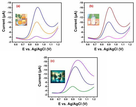 The GCE/g-C3N4/Cu2Y2O5 electrode was evaluated for its practicality in identifying SMZ in real samples of cow milk, honey, and Tamsui river water using the DPV approach (Figure 7a–c). The range of SMZ recovery rates was 92–98%. These results demonstrated that the GCE/g-C3N4/Cu2Y2O5 electrode was used with satisfactory results to analyze SMZ in real samples. The recovery percentage findings are displayed in Table 2. Even when milk, honey, or Tamsui river water contains other interfering molecules, the DPV approach uniquely finds SMZ. Because the SMZ detection peak potential and peak current were not affected by other interfering molecules, such as anions, cations, metal ions, and other biomolecules, the developed GCE/g-C3N4/Cu2Y2O5 electrode is the ideal match for the accurate and successful sensing of SMZ from the real sample in the presence of other interfering molecules. According to the real sample analysis, the GCE/g-C3N4/Cu2Y2O5 electrode shows good sensing feasibility for SMZ detection.