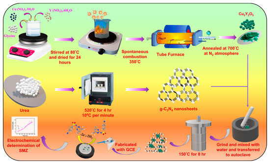 Sulfamethazine (SMZ), frequently referred to as 4-amino-n-(4, 6-dimethylpyrimidin-2-yl) benzene sulfonamide, pertains to the sulfonamide family, a widely used class of veterinary medicine, antimicrobial agents, and a preventative measure. In recent times sulfamethazine has gained quite an impressive amount of interest because of being one of the essential antibacterial medications for treating several illnesses, including urinary tract infections, chancroid, Toxoplasma gondii encephalitis, etc. [1]. However, SMZ overdose or prolonged exposure in the human body can lead to severe chronic toxicity, inflammation of the liver, and genetic disruption, which could boost death and disability rates [2]. Moreover, excess consumption of SMZ tends to stimulate carcinogenesis, tetra genesis, and mutagenesis. For this reason, it is crucial to find SMZ in consumables at trace levels [3]. For this reason, we have developed a precise method for detecting SMZ. There are enormous methods to detect SMZ compared to other analytic methods like capillary electrophoresis [4], UV spectrophotometry, and biosensors [5]. These aforementioned techniques are used to analyze SMZ on food samples. Moreover, the detection of SMZ in animal fluids and tissue detection methods include gas chromatography, chemical ionization, electron-capture or flame ionization detection, immunoassay, calorimetric, enzyme-linked immunosorbent analysis, and screening for microbial diffusion. Most of these approaches involve a time-consuming, expensive, and labor-intensive sample preparation process; nevertheless, their sensitivity and specificity are low [6,7,8]. In this regard, electrochemical approaches provide advantages such as enhanced sensitivity, user-friendliness, and fully portable instrumentation [9]. In recent times, transition metal oxides have attracted many researchers because of their excellent ability in energy conversion, energy storage, and sensing applications. In addition, copper yttrium oxide (Cu2Y2O5) components [10] are used for solid-state galvanic cells, superconducting materials, p-type semiconductor material, and photocatalytic, and antibacterial properties against E. coli in a dark environment. Moreover, the high photocatalytic activity of the Cu2Y2O5 component applied to hydrogen evolution because of good electron transfer, high surface area, thermal stability, catalytic activity, electromagnetic properties, and layered structure of the Cu2Y2O5 component. In addition, the as-prepared Cu2Y2O5 has unique size-dependent properties. Therefore, based on the aforementioned properties, we have used the Cu2Y2O5 component for the electrochemical sensor application [11,12,13,14]. However, the material shows good sensing performance but it does not exhibit prolonged ability to enhance its stability; therefore, we have to make a composite consisting of graphitic carbon nanosheets (g-C3N4). However, compared to graphene, g-C3N4 has a large active area and unique porous networks [15,16,17]. For instance, g-C3N4 actively modifies the electrical characteristics, making it a suitable material for anchoring dynamic mixed-metal oxide species that enhance electrochemical stability and selectivity [18,19,20,21,22]. Consequently, the construction of Cu2Y2O5 anchored g-C3N4, which has many electroactive sites and remarkable endurance towards the determination of SMZ, making it ideal for use in sensing applications [23].