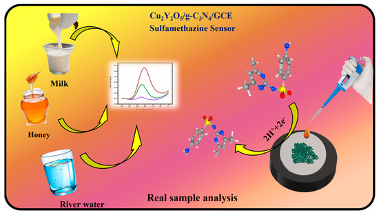 Assessing the potential threats that pharmaceutical toxicity may pose to human health and the environment requires real sample monitoring. It has contributed to the practical application of the g-C3N4/Cu2Y2O5 composite-modified GCE in SMZ determination in real sample analysis. As previously noted, real samples are typically free of SMZ. Examples of such samples are milk, blood serum, poultry, fish, meat, honey, water, etc. [3,28]. Hence, real samples were added with a predetermined amount of SMZ utilizing standard addition methods (Scheme 3).