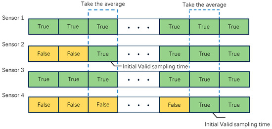 In the adaptive weighted fusion algorithm, when valid bits are not taken into account, the first sampling point is unable to undergo the covariance error recursion. At this juncture, the fusion value is determined by calculating the average measurement value from each sensor. When the valid bit of off-target amount is determined by a random process, it is possible for a sensor measurement at a specific moment to align with the first valid off-target amount sampling point. This sensor is described as being in the initial valid moment. Sensors at the initial valid moment are unable to employ the recursive form of the weighted fusion algorithm outlined in Section 2.2 for weight calculation. If, at a specific time point, there exist sensors with a valid off-target amount bit set to “true”, encompassing those present at the initial valid time point, the fusion value is determined as the average of the measurements obtained from sensors with true valid bits at that particular time point, as illustrated in Figure 3.