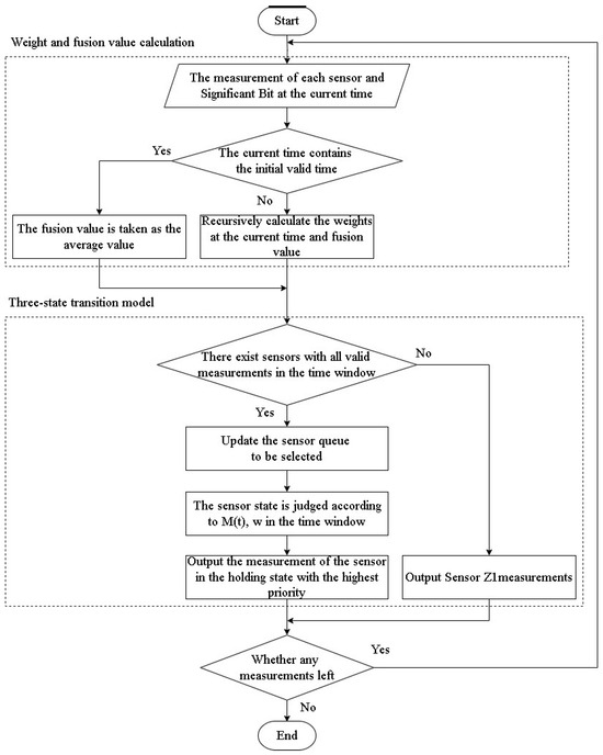 It is important to highlight that the switching state of a sensor is “transparent” to the measurement output. In other words, the switching state functions as a virtual state, serving solely as a conditional branch in the determination of the current state of the sensor under evaluation. When a sensor is in a switching state, the algorithm continues to output measurements from other sensors that are in the holding state. From an external perspective, the model consistently provides either the measurements from the holding state or the weighted fusion values.