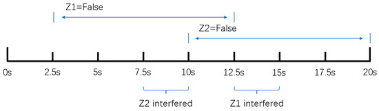 The simulation experiment sets Z1 measurement as invalid at 2.5 s, with the off-target amount valid bit set to false. It becomes valid again at 12.5 s. Z2 measurement is set as invalid at 10 s and remains invalid until the end. At 12.5 s, Z1 experiences interference until 15 s, and at 7.5 s, Z2 experiences interference until 10 s, as shown in Figure 5.