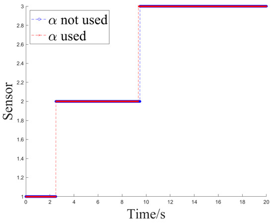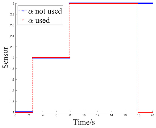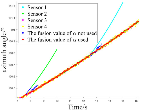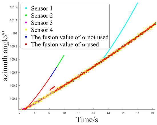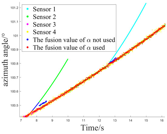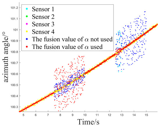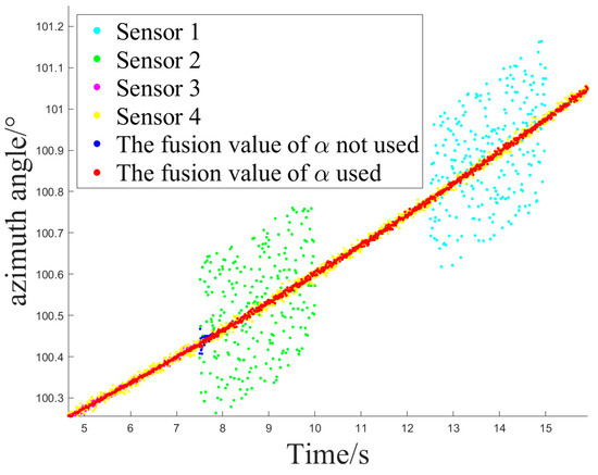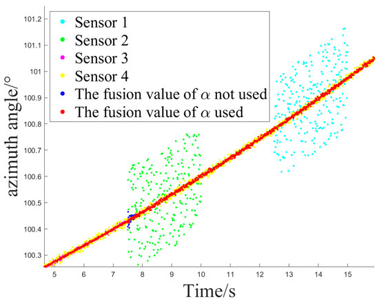 Within the current time window, if all values of the azimuth or elevation angle measurements of Sensor surpass a predefined threshold value , or if some points exceed while all points of wi remain below a specified threshold , it indicates that the sensor data is not suitable for servo control. This situation is denoted as the switch state. When values are significantly high within the window, it indicates a substantial deviation of the measurement from historical data, making the comparison of weighted coefficients irrelevant. Therefore, further examination of the weight coefficients is necessary only when certain values surpass the acceptable range to determine the measurement’s superiority among other sensors. If the weight coefficient is excessively low, the sensor may not be considered suitable for continued use as the output.