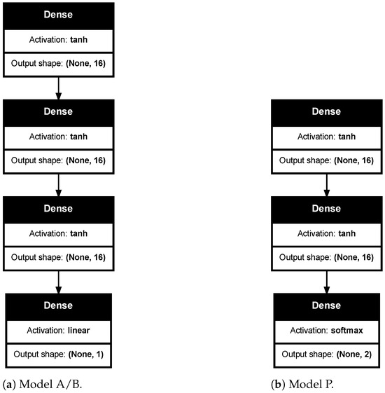 In Figure 2, the architectures of the individual models used are presented. The regression models (Model A and Model B) share a similar structure (Figure 2a). It consists of three hidden fully connected layers (Dense) with 16 perceptrons [24] in each. A fully connected layer means every input of the input vector influences every output of the output vector (all possible connections layer-to-layer are present). The output shapes of each layer are denoted with pairs enclosed in parentheses, where “None” indicates a dummy dimension. The input shape of each layer is the output shape of the previous one, except for the first layer whose inputs are equal to the dimension of . The used activation function for all layers except the last one is tanh [25]. The output layer has a linear activation function, which is well suited for regression problems.