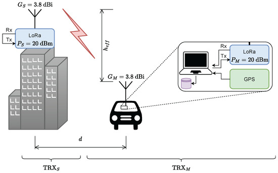 The dataset for training the models and evaluating the performance of the proposed approach is provided by a dedicated measurement setup developed by the authors. The objective of the measurement is to create a dataset of primary parameters by which the attenuation can be determined as a function of transmitter and receiver locations, absolute altitudes of the transmitter and receiver antennas, and statistics of the profile transmitter–receiver. Because the operating frequency is in the free ISM range, LoRa modules for machine-to-machine communications are used as measurement transceivers. Each module consists of an ultra-low-power long-range transceiver of type SX1276 made by Semtech Corporation [27] and a microcontroller for control, processing, and interfacing via a universal asynchronous receiver–transmitter (UART). Another reason to use these modules is because the LoRa technology is tied to a high receiver sensitivity of −148 . This implies measurements of greater distances between the transmitter and the receiver, especially in urban areas. Doppler shift is compensated for a frequency of up to at a bandwidth of 125 . The operating frequency of 433 allows ground mobile measurements with high offset rates. The software (version 1.0.0) for the embedded controller has the function to extract the received power value averaged over the received digital frame. In Figure 3 is depicted the proposed measurement concept as well, as the used equipment.