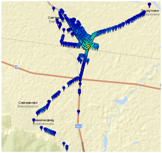 Ground mobile measurements at a low vehicle speed of no more than 30 are carried out for the selected areas. The mobile antenna is mounted on the top of the vehicle at a height m. The total number of measurement records is 4490. In Figure 5 and Figure 6 are shown the maps of geographical points associated with measurement records for Septemvri and Belogradchik.