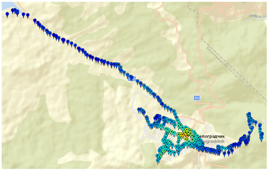 Map of geographical points associated with measurement records for Belogradchik town (Bulgaria), rural and suburban areas.