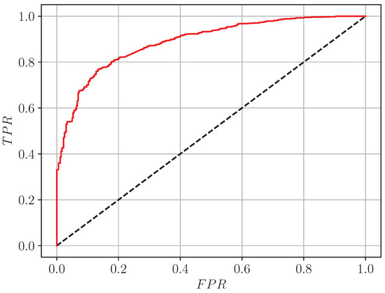A perfect classifier has an value equal to 1. In Figure 10 is shown the ROC curve of Model P (red line). The achieved value of the area under the ROC curve is . The so-called random chance line (the black dashed one) is also given in the figure. It corresponds to a complete classification uncertainty. By visual inspection, the “elbow” of the curve does not lie on the diagonal . This corresponds to a decision threshold different from 0.5 for binary classification. This is an indicator that the model is not perfect. Nevertheless, considering the corresponding , the model has a good discrimination capacity.