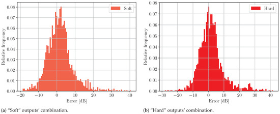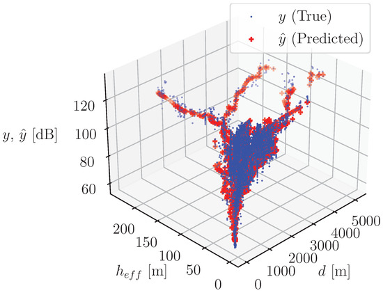 In Figure 15, the true and predicted outputs are visualized when using the compound model with the “soft” combination versus distance, d, and effective antenna height, .