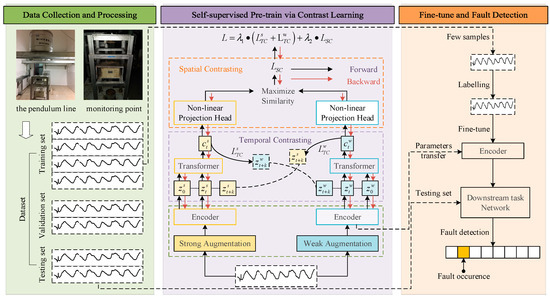 This section introduces a method for dam anomaly detection using spatiotemporal contrastive learning. As illustrated in Figure 1, the comprehensive framework encompasses the following three pivotal stages: data acquisition and preprocessing, self-supervised pretraining, and fine-tuning coupled with anomaly detection. Initially, during the data collection and preprocessing stage, dam deformation data are automatically gathered from the dam’s pendulum monitoring system. The data are preprocessed to construct the dataset, which is subsequently segmented into training, validation, and testing subsets in predefined ratios, readying it for model ingestion. In the self-supervised pretraining stage, the method leverages transformer architectures alongside nonlinear projection heads to extract spatiotemporal features from the datasets. These features undergo pretraining through a spatiotemporal contrastive training strategy, optimizing the model to recognize pertinent data characteristics. The final stage, fine-tuning and anomaly detection, involves adapting the pretrained model parameters for specific downstream applications. Here, the model is refined using a minimal set of labeled data, after which it is deployed for the task of anomaly detection, thus concluding the process.
